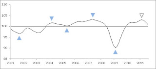 En el último trimestre (julio 2011) este indicador alcanzaba 101,4 puntos y a fines del mes de setiembre 2011, se ha reducido hasta 100,8 puntos, quedando sólamente EE.UU, Alemania y la Federación Rusa, las que alcanzaban mas de 100 puntos en este indicador.